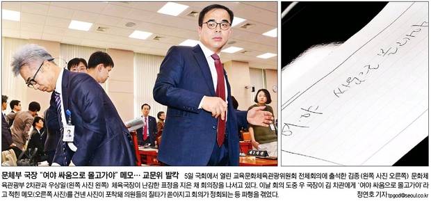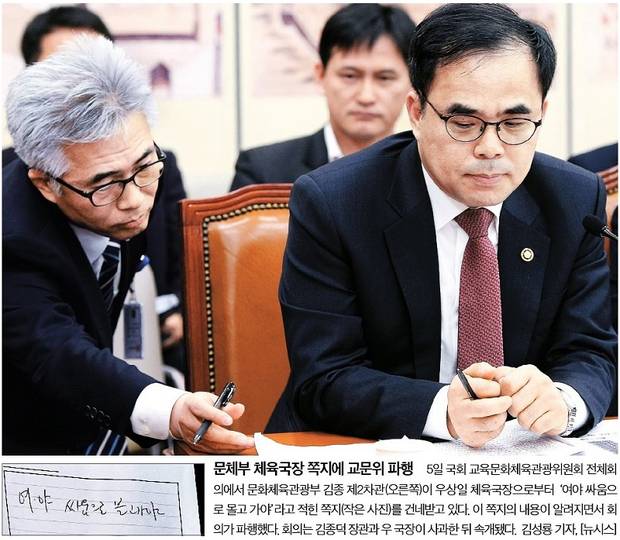 박근혜 대통령이 유진룡 전 문화체육관광부 장관에게 문체부 국‧과장 교체를 지시했다는 한겨레 단독 보도 내용을 5일 청와대가 인정했다. 이와 관련 5일 국회에서 열린 교육문화체육관광위원회 전체회의에선 우상일 문체부 체육국장이 “여야 싸움으로 몰고 가야”라고 적힌 쪽지를 김종 2차관에게 전달하는 장면이 카메라에 잡히면서 소동이 일었다. 서울신문과 중앙일보는 쪽지 공개 뒤 우 국장과 김 차관이 난감한 표정을 짓고 있는 사진을 1면에 실었다.