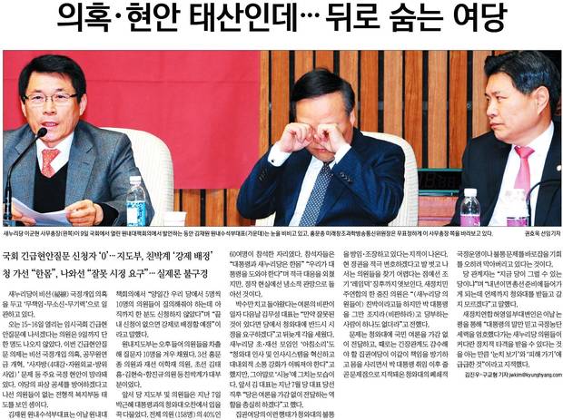 경향신문은 이날 1면 사진으로 새누리당 이군현 사무총장이 9일 국회에서 열린 원내대책회의에서 발언하는 동안 김재원 원내수석대표가 눈을 비비고 있는 장면을 실었다.