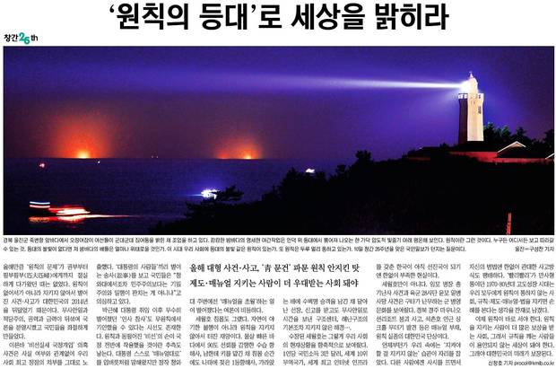 국민일보는 창간 26주년 기념호에서 '원칙의 등대'로 세상을 밝힌다는 의지로 경북 울진군 죽변항 앞바다에서 오징어잡이 어선들이 군데군데 집어등을 밝힌 채 조업하고 있다는 장면을 담았다.