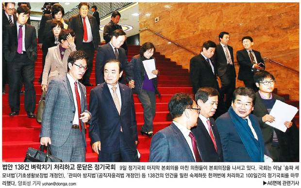 동아일보는 '법안 138건 벼락치기 처리하고 문닫은 정기국회'란 1면 사진 기사를 통해 9일 정기국회 마지막 본회의를 마친 의원들이 본회의장을 나서는 장면을 실었다.