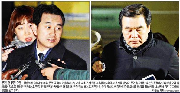 서울신문은 '문건 연루된 2인'이란 사진 기사를 통해 '정윤회씨 국정개입 의혹 문건'의 핵심 인물들이 9일 서울 서초구 서초동 서울중앙지검에서 조사를 받고 나온 장면을 싣었다.