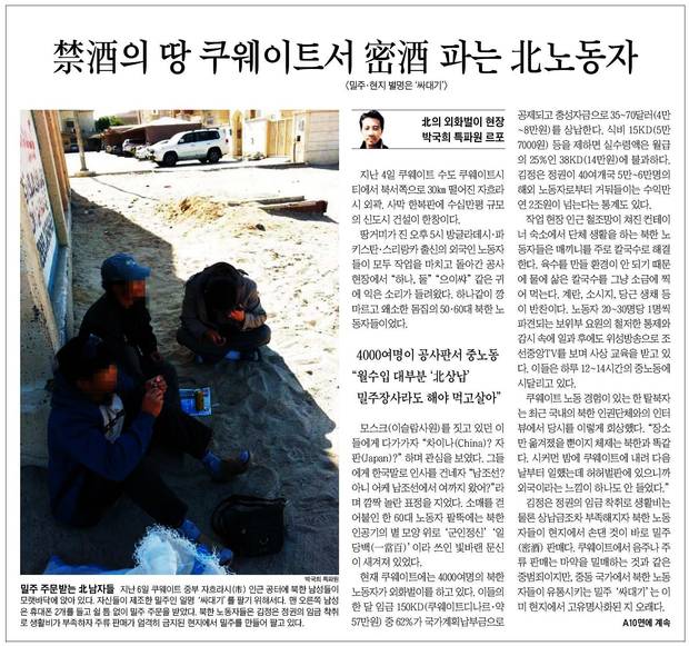 조선일보는 '밀주 주문받는 北남자들'이란 1면 사진기사에서 지난 6일 쿠웨이트 중부 자흐라시 인근 공터에 북한 남성들이 모랫바닥에 앉아 자신들이 제조한 밀주인 일명 '싸대기'를 팔고 있는 장면을 담았다.