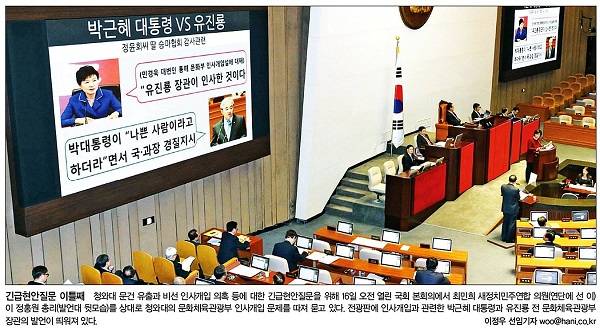 한겨레는 16일 오전 청와대 문건 유출과 비선 인사개입 의혹 등에 대한 긴급현안질문을 위해 의원들이 국회 본회의를 진행하는 사진을 1면에 실으며 “국정개입 의혹은 그대로인데 검찰수사는 이대로 끝내나”라며 우려했다.