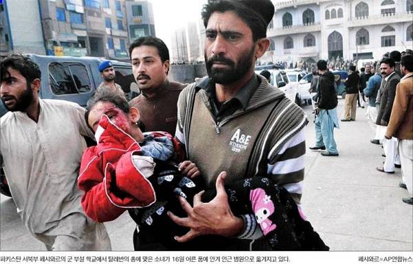 이슬람 극단주의 무장 단체인 탈레반 세력이 파키스탄의 한 학교에 난입한 후 무차별 총격을 가해 10대 학생과 교사 등 최소 126명이 사망했다. 최소 122명 이상인 부상자 중에는 중상자가 많아 희생자는 더 늘어날 것으로 예상되는 가운데 이날 일부 신문들은 관련 사진을 1면에 실었다.