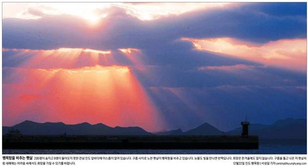 경향은 1면 사진 ‘팽목항을 비추는 햇살’에서 “구름 사이로 노란 햇살이 팽목항을 비추고 있습니다. 눈물도 빛을 만나면 반짝입니다. 희망은 한겨울에도 얼지 않습니다. 구름을 뚫고 나온 저 햇살처럼 새해에는 어려움 속에서도 희망을 가질 수 있기를 바랍니다”라고 했다.