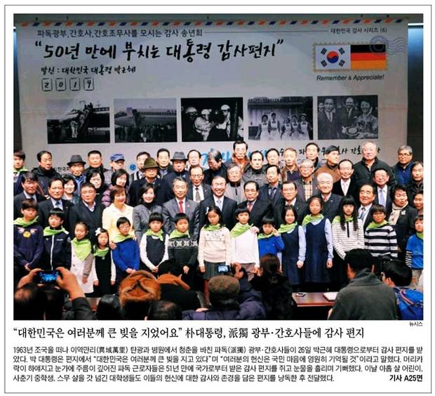 중앙은 파독 간호사 출신 참석자가 박 대통령의 감사 편지를 전달받은 뒤 눈물을 흘리는 모습을 1면에 실었고, 조선은 박 대통령의 편지 내용을 전하며 “머리카락이 하얘지고 눈가에 주름이 깊어진 파독 근로자들은 51년 만에 국가로부터 받은 감사 편지를 쥐고 눈물을 흘리며 기뻐했다”고 보도했다.