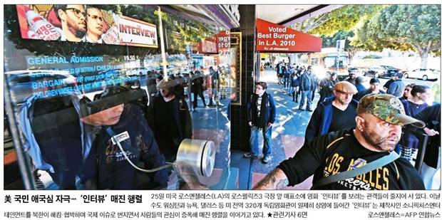 북한 김정은 암살을 소재로 한 코미디 영화 ‘인터뷰’ 상영을 앞두고 북한이 미국 영화사를 해킹했지만 오히려 미국인들의 애국심에 불을 지폈다는 평가다. 한국일보는 25일 미국 로스앤젤레스의 한 영화관 매표소에 관객이 줄지어 있는 모습을 1면에 싣고 “이날 수도 워싱턴과 뉴욕, 댈러스 등 미 전역 320개 독립영화관이 일제히 상영에 들어간 ‘인터뷰’는 제작사인 소니픽처스엔터테인먼트를 북한이 해킹·협박하며 국제 이슈로 번지면서 사람들의 관심이 증폭해 매진행렬을 이어가고 있다”고 전했다.