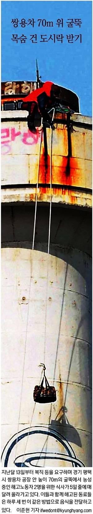 경향신문은 지난달 13일부터 복직 등을 요구하며 경기 평택시 쌍용차 공장 안 높이 70m의 굴뚝에서 농성 중인 해고노동자 2명이 지상에서 올려주는 식사를 받는 모습을 1면 사진으로 보도했다. 경향은 ‘쌍용차 70m 위 굴뚝 목숨 건 도시락 받기’란 제목의 사진 기사에서 “이들과 함께 해고된 동료들은 하루 세 번 이 같은 방법으로 음식을 전달하고 있다”고 설명했다.