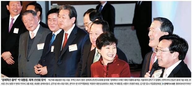 정윤회 씨의 국정 농단 의혹이 담긴 문건을 처음 보도한 세계일보와 정윤회 씨를 단독 인터뷰했던 중앙일보는 검찰 대신 재계 신년 인사회에 참석해 환하게 웃고 있는 박근혜 대통령의 모습을 1면에 담았다. 박 대통령은 5일 서울 삼성동 코엑스에서 열린 ‘2015년 경제계 신년인사회’에 참석해 “올해가 경제 재도약의 마지막 기회라는 인식을 갖고 경제혁신 3개년 계획 이행에 총력을 기울이겠다”고 말했다.