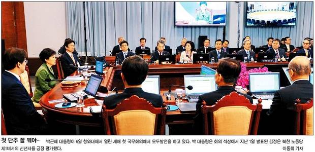 국민일보는 6일 청와대에서 열린 새해 첫 국무회의에서 박근혜 대통령이 모두발언을 하는 사진을 1면에 게재했고, 동아일보는 자사와 인촌기념회와 채널A, 고려대 공동 주최로 열린 ‘선진사회로 가는 대한민국의 과제’ 심포지엄을 1면 사진으로 보도했다. 동아는 “이날 심포지엄에선 우리 사회 공공성 붕괴의 원인과 해법이 다양하게 제시됐다”고 전했다.