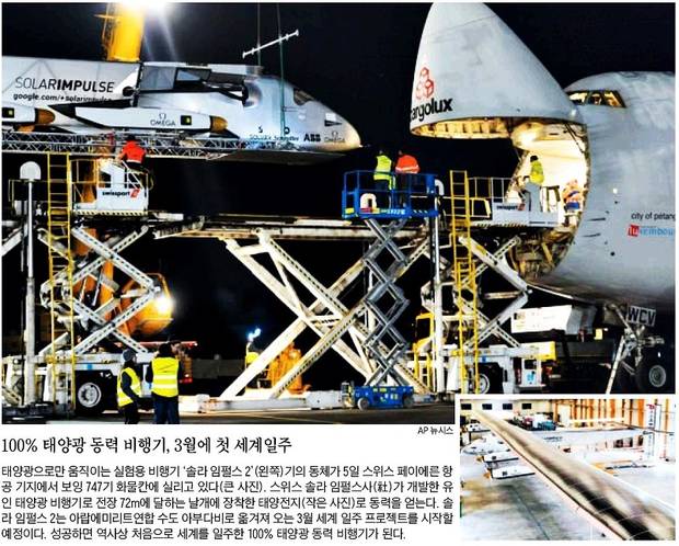 조선일보는 100% 태양광 동력으로만 움직이는 실험용 비행기 ‘솔라 임펄스2’의 위용을 1면에 담았다. 조선은 “스위스 솔라 임펄스사가 개발한 유인 태양광 비행기로 전장 72m에 달하는 날개에 장착한 태양전지로 동력을 얻는다”고 설명하며 “솔라 임펄스2는 아랍에미리트연합 수도 아부다비로 옮겨져 오는 3월 세계 일주 프로젝트를 시작할 예정”이라고 전했다. 성공하면 역사상 처음으로 세계를 일주한 100% 태양광 동력 비행기가 된다.