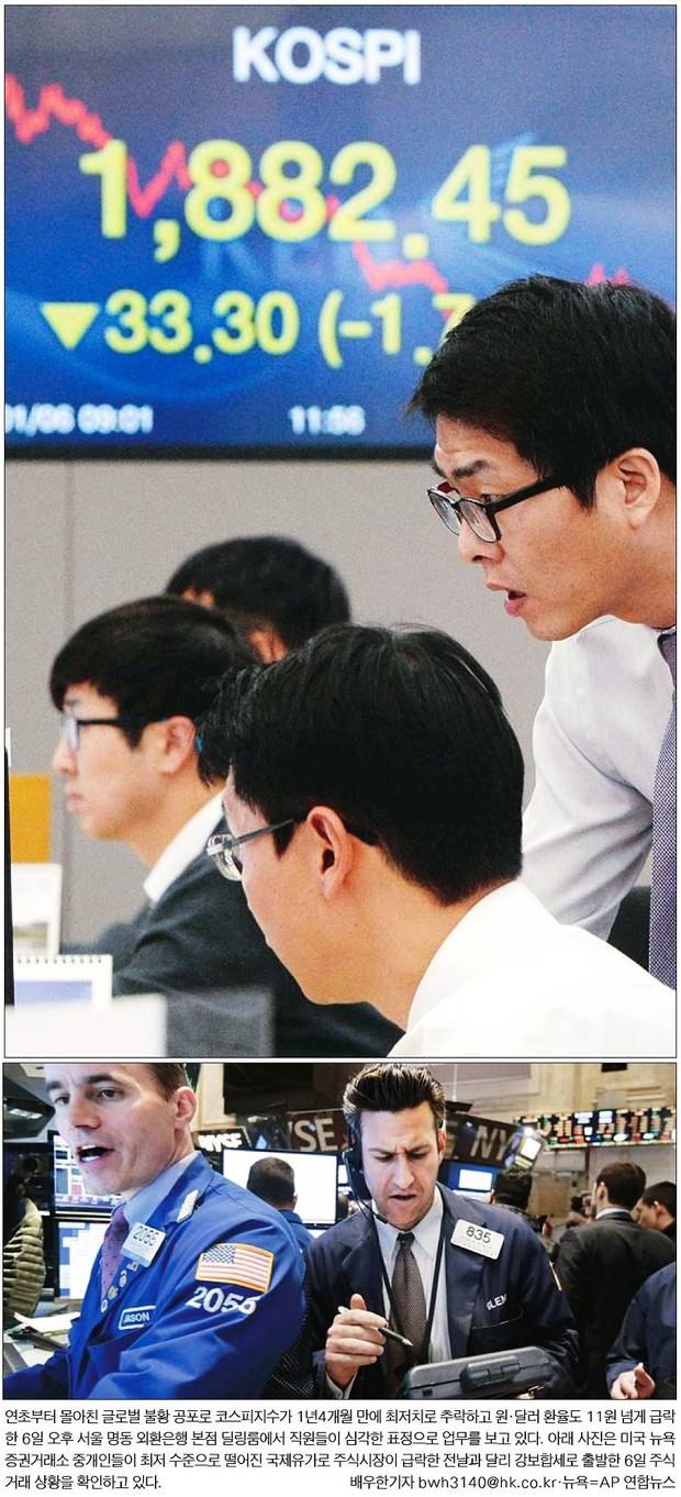 유가 급락과 그리스발 위기에 따른 불안으로 글로벌 증시가 일제히 급락했다. 6일 코스피는 전날보다 33.30포인트 하락해 1900선마저 붕괴되며 1년4개월 만에 최저치를 기록했다. 세계일보는 6일 서울 중구 외환은행 딜링룸에서 1882.45라는 코스피 수치를 배경으로 분주히 움직이는 직원들의 모습을 1면 사진으로 보도했다. 한국일보도 같은 사진과 함께 최저 수준으로 떨어진 국제유가로 주식시장이 급락한 전날과 달리 강보합세로 출발한 6일 주식 거래 상황을 확인 중인 미국 뉴욕 증권거래소 풍경을 1면에 나란히 실었다.
