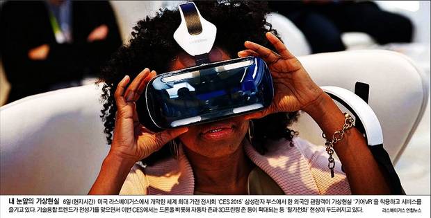 서울신문은 6일(현지시각) 미국 라스베이거스에서 개막한 세계 최대 가전 전시회 ‘CES 2015’ 삼성전자 부스에서 한 외국인 관람객이 가상현실 ‘기어VR’을 착용 중인 모습을 1면으로 보도했다. 서울은 “기술융합 트렌드가 전성기를 맞으면서 이번 CES에서는 드론을 비롯해 자동차 존과 3D프린팅 존 등이 확대되는 등 ‘탈가전화’ 현상이 두드러지고 있다”고 전했다.