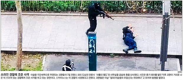 조선일보는 총기 테러를 벌인 직후 거리로 나온 괴한이 쓰러져 있는 경찰에게 조준 사격을 하고 있는 장면을 1면 사진으로 보도했다. 출처는 트위터였다. 스카이뉴스는 이 경찰이 사망했다고 전했다. 조선은 “괴한들은 이날 “알라(이슬람의 유일신)는 위대하다”고 외치며 범행을 벌였다”고 설명했다.