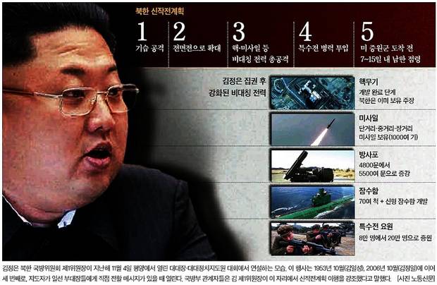 중앙일보는 <김정은 ‘7일 전쟁’ 작계 만들었다>는 제목의 1면 머리기사와 함께 김정은 북한 국방위원회 제1위원장의 사진을 크게 실었다. ‘기습 공격’으로 시작해 ‘미 증원군 도착 전 7~15일 내 남한 점령’으로 끝나는 ‘북한 신작전계획’과 김정은 집권 후 강화된 비대칭 전력도 이미지로 함께 보도했다.