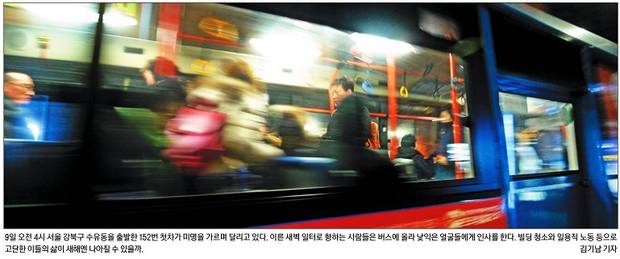 경향신문은 1면에서 ‘새벽 첫차를 타는 사람들’의 풍경을 스케치했다. 9일 오전 4시 서울 강북구 수유동을 출발한 152번 첫차가 미명을 가르며 달리는 사진을 싣고 “이른 새벽 일터로 향하는 사람들은 버스에 올라 낯익은 얼굴들에게 인사를 한다. 빌딩 청소와 일용직 노동 등으로 고단한 이들의 삶이 새해엔 나아질 수 있을까”라는 설명을 담았다.