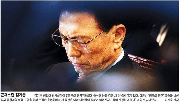 10일 주요 종합일간지 1면에는 청와대 역사상 초유의 항명 파문에 곤혹스러워 하고 있는 김기춘 비서실장의 표정이 담겼다. 동아일보와 조선일보는 9일 김 비서실장이 국회 운영위에 출석해 입을 굳게 다문 채 의원들 질문을 듣고 있는 사진을, 세계일보는 운영위에 출석해 업무보고를 마친 뒤 고개 숙여 인사하는 김 비서실장의 모습을 1면에 실었다.