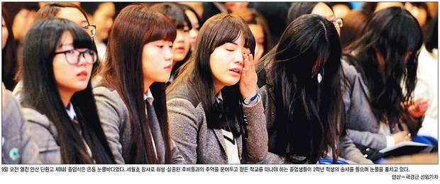 ‘세상에서 가장 슬픈 졸업식’. 국민일보는 9일 열린 경기도 안산 단원고 졸업식 사진에 이 같은 제목을 붙였다. 국민은 이날 졸업식이 온통 눈물바다였다고 전하며 “세월호 참사로 희생‧실종된 후배들과의 추억을 묻어두고 정든 학교를 떠나야 하는 졸업생들이 2학년 학생의 송사를 들으며 눈물을 훔치고 있다”고 설명했다. 한겨레도 세월호 참사 때 생존한 2학년 여학생이 재학생 대표로 졸업생들에게 ‘보내는 글’을 읽으며 눈물을 훔치는 사진을 우측 하단에 실었다.