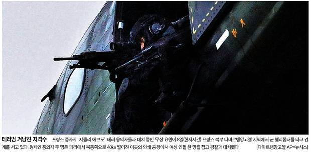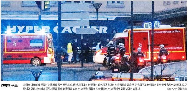 지난 7일 프랑스 주간지 ‘샤를리 엡도’ 사무실에서 언론인과 경찰 등 12명을 살해하고 달아났던 테러 사건 용의자들이 9일(현지시각) 인질극을 벌이며 경찰과 대치하다 사살됐다. 서울신문과 중앙일보는 테러 용의자들과 대치 중인 무장 요원이 군 헬리콥터를 타고 경계를 서고 있는 모습을 1면에 실었다. 한국일보도 인질극이 벌어지는 현장의 긴박한 모습을 1면으로 보도했다. 한국은 “도주 중이던 언론사 테러범 도주지원을 위해 인질극을 벌인 이 괴한은 경찰에 사살됐으며 이 과정에서 인질 2명이 숨졌다”고 전했다.