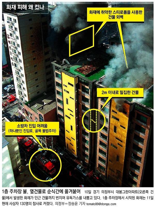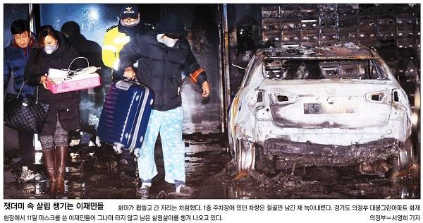 국민일보는 경기도 의정부 대봉그란아파트 화재 현장에서 마스크를 쓴 이재민들이 그나마 타지 않고 남은 살림살이를 챙겨 나오는 모습을 1면 사진으로 담으며 “이번 사고는 인재(人災)”라고 비판했다. 국민일보는 “서민 주거 안정을 위해 규제를 완화한다며 ‘안전’을 팽개친 대가를 치렀다”면서 “‘10층 이하’ 건물은 ‘11층 이상’보다 안전할 거라며 각종 안전 규정을 느슨하게 적용한 소방 정책 등이 참사를 막지 못한 원인이 됐다”고 보도했다.