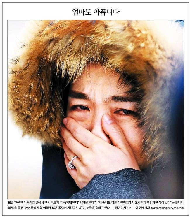 경향신문은 17일자 1면 사진에서 지난 16일 인천 한 어린이집 앞에서 한 학부모가 '아동학대반대'를 서명을 받다가 "내 손녀도 다른 어린이집에서 교사한테 폭행당한 적이 있다"는 할머니의 말을 듣고 "아이들에게 왜 이렇게 많은 폭력이 가해지느냐"며 눈물을 흘리고 있는 모습을 담았다.