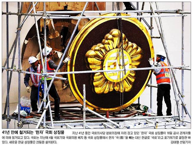 국민일보와 한국일보는 이날 지난 41년 동안 국회의사당 본회의장에 자리 잡고 있던 '한자' 국회 상징물이 16일 공사 관계자들에 의해 철거되고 있는 장면을 담았다. 국회는 지난해 4월 국회기와 국회의원 배지 등 국회 상징물에서 한자 '국(國)'을 빼는 대신 한글로 '국회'라고 표기하기로 결정한 바 있다. 새로운 한글 상징물은 23일쯤 설치된다.