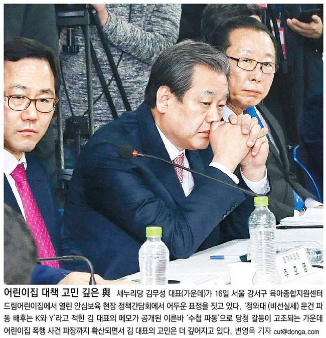 동아일보는 새누리당 김무성 대표가 16일 서울 강서구 육아종합지원센터드림 어린집에서 열린 안심보육 현장 정책간담회에서 어두운 표정을 짓고 있는 모습을 전했다. '청와대(비선실세) 문건 파동 배후는 K와 Y라고 적힌 김 대표의 메모가 공개된 이른바 '수첩 파동'으로, 당청 갈등이 고조되는 가운데 어린이집 폭행사건 파장까지 확산되면서 김 대표의 고민은 더 깊어지고 있다.