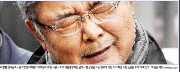 서울신문은 이경훈 전국금속노동조합 현대자동차지부장이 16일 서울 서초구 서울중앙지법 앞에서 통상임금 소송 결과에 대한 기자회견 도중 눈살을 찌푸리고 있는 장면을 실었다.