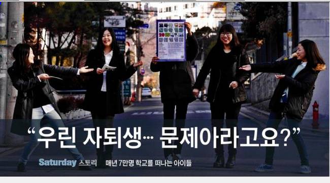 세계일보는 '자퇴설명회'를 기획한 학교 밖 청소년들이 지난 8일 홍보 포스터를 들고 포즈를 취하고 있는 장면을 실었다.