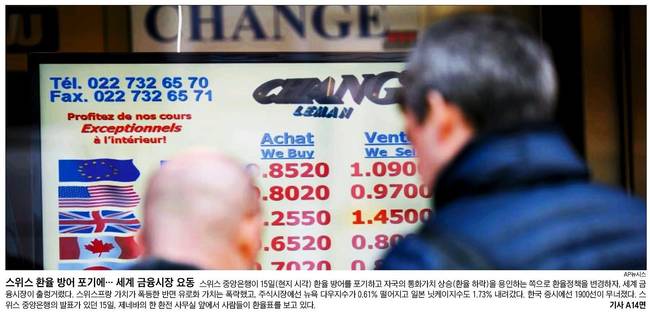 조선일보는 '스위스 환율 방어 포기에…세계 금융시장 요동'이란 사진 기사에서 스위스 중앙은행의 발표가 있던 15일(현지 시각), 제네바의 한 환전 사무실 앞에서 사람들이 환율표를 보고 있는 모습을 전했다. 조선은 스위스 중앙은행이 15일 환율 방어를 포기하고 자국의 통화가치(환율 하락)을 용인하는 쪽으로 환율정책을 변경하자, 세계 금융시장이 술렁거리고 있다고 전했다.