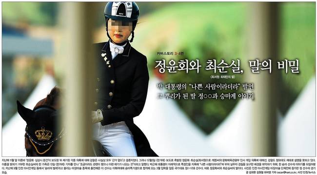 한겨레는 '정윤회와 최순실, 말의 비밀'이란 기사에서 지난해 9월 인천 아시안게임에서 '승마의 발레'라고 불리는 마장마술 종목에 출전해 이화여대에 승마특기생으로 합격해 오는 3월 입학을 앞둔 정윤회씨와 최순실씨의 딸 모습을 담았다.