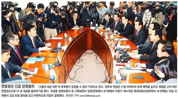 동아일보도 당정협의 모습을 1면 사진으로 내걸면서 “‘13월의 세금 대란’의 후폭풍이 걷잡을 수 없이 거세지고 있다”고 전했다. 동아일보는 관련 기사를 통해 “‘13월의 울화통’이 된 올해 연말정산과 관련해 납세자들의 조세저항이 거세지자 정부와 여당이 결국 무릎을 꿇었다”면서 “‘증세 없는 복지’라는 대선 공약을 지키기 위해 비과세·감면 축소로 세수를 늘리는 우회로를 택했다가 봉급생활자들의 반발로 부메랑을 맞은 것”이라고 분석했다.