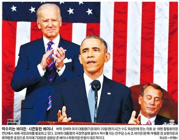 세계일보는 ‘박수치는 바이든·시큰둥한 베이너’라는 제목의 사진을 통해 오바마 대통령의 국정연설에 일어서 박수를 치는 민주당 소속 조 바이든 부통령 겸 상원의장과 못마땅한 표정으로 의자에 기대앉은 공화당 존 베이너 하원의장의 대조적인 반응을 1면에 실었다. 세계일보는 관련 기사를 통해 “오바마 대통령은 건설현장이 살아나고 직업교육이 활성화해야만 점차 꿈과 희망을 꿈꾸는 중산층이 늘 것이라고 강조했다”며 “집권2기 후반부야말로 자신이 중산층을 살리는 진정한 정치를 펼 수 있다고 주장했다”고 보도했다.