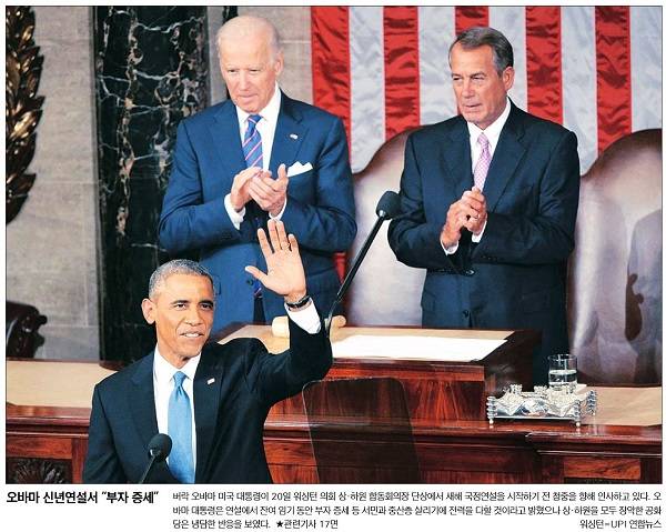 한국일보도 새해 국정연설을 시작하기 전 청중을 향해 인사하는 오바마 대통령의 모습을 1면 사진으로 실었다. 한국일보는 “오바마 대통령은 연설에서 잔여 임기 동안 부자 증세 등 서민과 중산층 살리기에 전력을 다할 것이라고 밝혔다”면서 “그러나 상·하원을 모두 장악한 공화당은 냉담한 반응을 보였다”고 전했다.