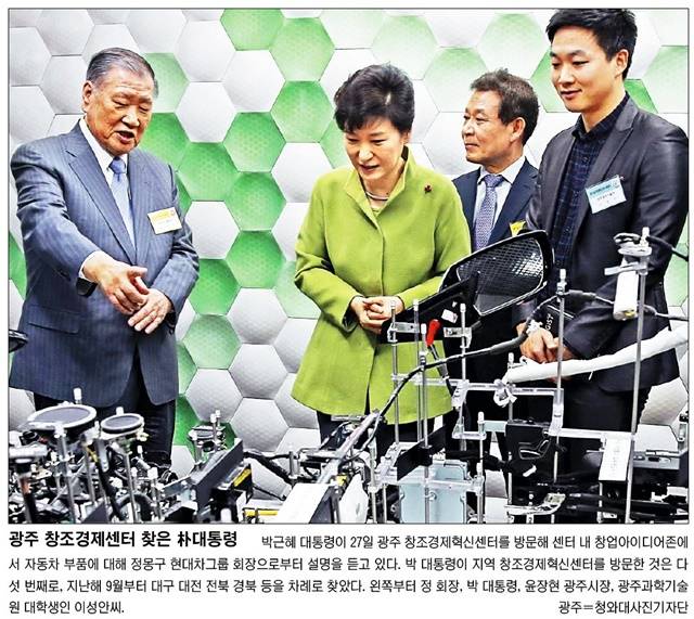 박근혜 대통령이 지난 27일 광주 창조경제혁신센터를 방문했다. 이날 박 대통령은 ‘수소 경제’ 육성 방침을 밝힌 현대차그룹 정몽구 회장을 만나 관련 설명을 들었다. 국민일보, 동아일보, 세계일보, 조선일보는 이 모습을 1면 사진으로 선택했다.