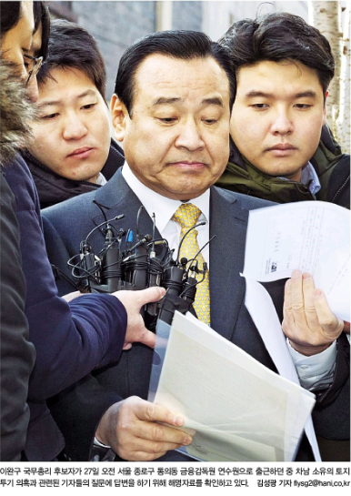 한겨레는 1면 사진을 통해 이완구 국무총리 후보자가 지난 27일 금융감독원 연수원으로 출근하던 중 차남 소유의 토지 투기 의혹과 관련에 기자들의 질문에 답변하는 모습을 전했다. 한겨레는 관련 기사를 통해 “정작 땅을 증여받은 차남의 재산은 고지를 거부해 관련 의혹이 명확하게 해소되지 않고 있다”고 보도했다.