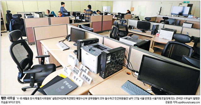 경향신문은 ‘4·16 세월호 참사 특별조사위원회’ 설립준비단에 파견됐던 해양수산부 공무원들이 일방 철수를 했다며 서울지방조달청 내 있는 텅 빈 준비단 사무실을 1면 사진을 통해 보도했다. 경향은 “여론에 밀려 마지못해 세월호특별법에 합의한 여당이 딴죽을 걸고 정부는 기다렸다는 듯이 공무원들을 철수시키면서 특위 설립준비단이 ‘개점휴업’ 상태에 빠졌다”고 했다.