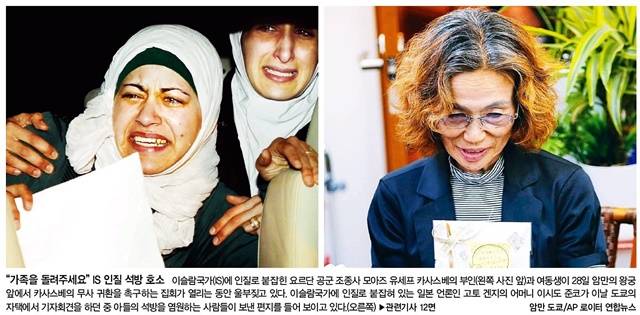 한겨레는 IS에 인질 석방을 호소하는 가족들의 모습을 1면에 담았다. 한겨레는 “이슬람국가(IS)에 인질로 붙잡힌 요르단 공군 조종사 모아즈 유세프 카사스베의 부인과 여동생이 28일 암만의 왕궁 앞에서 카사스베의 무사 귀환을 촉구하는 집회가 열리는 동안 울부짖고 있다”며 “이슬람국가에 인질로 붙잡혀 있는 일본 언론인 고토 겐지의 어머니 이시도 준코가 이날 도쿄의 자택에서 기자회견을 하던 중 아들의 석방을 염원하는 사람들이 보낸 편지를 들어보이고 있다”고 전했다.