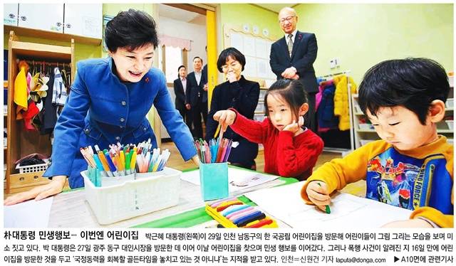 동아일보는 박근혜 대통령이 29일 인천 남동구의 한 어린이집을 방문한 사진을 1면에 실었다. 동아는 ‘박 대통령 민생행보… 이번엔 어린이집’이라는 제목의 1면 사진에서 “그러나 폭행 사건이 알려진 지 16일 만에 어린이집을 방문한 것을 두고 ‘국정동력을 회복할 골든타임을 놓치고 있는 것 아니냐’는 지적을 받고 있다”고 보도했다.