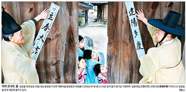 경향신문은 1면을 통해 다가올 봄 분위기를 일찍이 전했다. 경향은 경남 함양읍 지곡면 개평마을 함양향고 유림들이 ‘입춘대길 건양다경’이라고 쓴 입춘첩을 한옥 대문에 붙이는 모습을 1면에 실었다.
