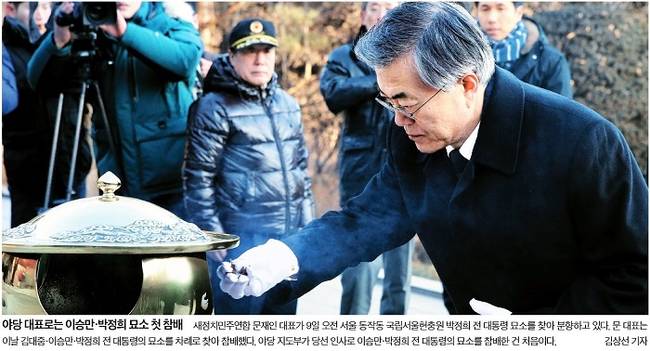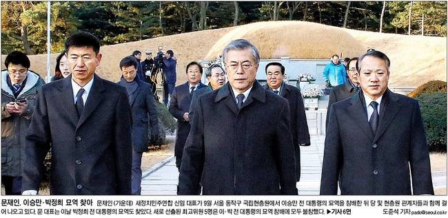 서울신문은 문재인 대표가 이승만 전 대통령의 묘역을 참배한 뒤 걸어나오는 사진을 실었다. 서울은 “새로 선출된 최고위원 5명은 이‧박 전 대통령의 묘역 참배에 모두 불참했다”고 전했다.