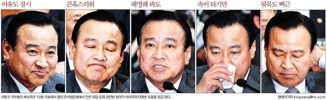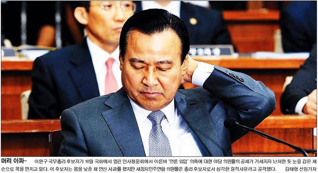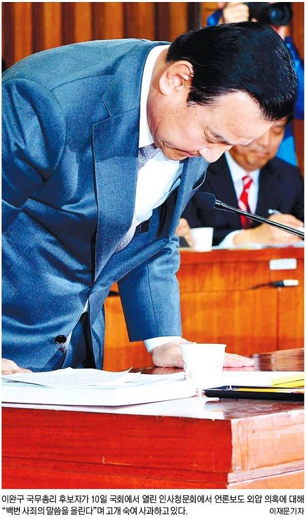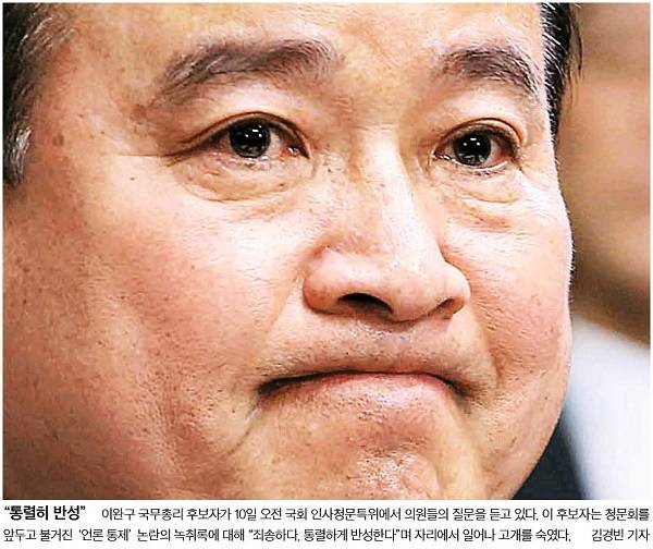 언론인을 회유, 협박하고 통제하는 발언이 10일 인사청문회에서 추가로 공개되어 곤혹을 치른 이완구 국무총리 후보자의 다양한 표정들이 11일자 주요 조간신문 1면을 장식했다. 이날 새정치민주연합은 이완구 후보자가 기자들과 가진 오찬 자리에서 자신이 언론인들을 대학 총장도 만들어주고, 언론인들을 위해 김영란법을 반대했다고 한 발언을 공개해 파장이 일었다.