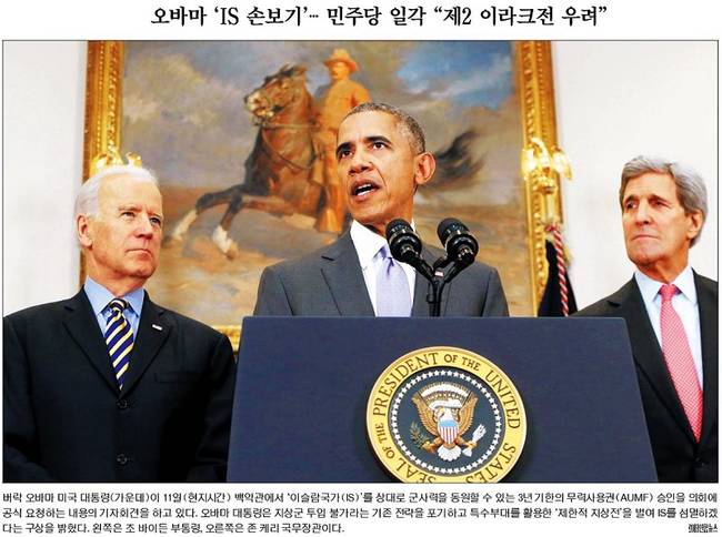 국민일보와 세계일보는 버락 오바마 미국 대통령이 이슬람 무장단체 IS를 상대로 군사력을 동원할 수 있는 3년 기한의 무력사용권의 승인을 의회에 요청하는 기자회견 사진을 1면에 실었다. 국민일보는 “오바마 대통령은 지상군 투입 불가라는 기존 전략을 포기하고 특수부대를 활용한 ‘제한적 지상전’을 벌여 IS를 섬멸하겠다는 구상을 밝혔다”고 전했다.