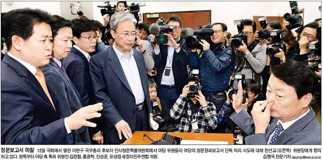 새누리당은 앞서 이날 이완구 국무총리 후보자 인사청문 보고서를 단독으로 채택해 야당의 반발을 샀다. 새누리당 소속인 한선교 ‘이완구 총리 후보자 인사청문특위’ 위원장은 새정치연합 의원들이 퇴장한 가운데 여당 단독으로 인사청문경과보고서를 채택했다. 13일 서울신문과 한겨레, 한국일보는 새정치연합 의원들이 한선교 위원장에게 항의하고 있는 사진을 1면에 실었다.