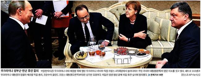 중앙일보는 우크라이나 사태 해결을 위해 우크라이나, 러시아, 독일, 프랑스 정상들이 4자 회담을 갖고 있는 사진을 1면으로 보도했다. 중앙은 사진에 대해 푸틴 러시아 대통령은 옅은 미소를 짓고 있는 반면, 페트로 포로센코 우크라이나 대통령과 앙겔라 메르켈 독일 총리, 프랑수아 올랑드 프랑스 대통령은 심각한 표정이라고 설명했다. 이들은 밤샘 협상 끝에 15일 휴전 실시에 합의했다.