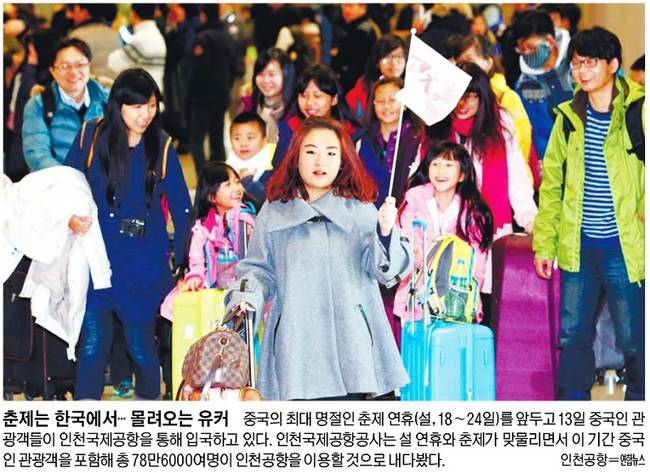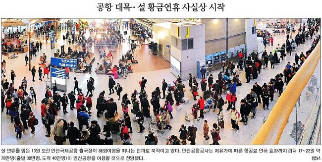 설 연휴를 앞두고 공항이 대목을 맞았다. 국민일보는 13일 해외여행을 떠나는 인파로 북적이는 인천국제공항의 모습을, 세계일보는 중국의 최대명절인 춘제 연휴(설, 18~24일)를 한국에서 맞기 위해 중국인 관광객들이 인천공항을 통해 입국하는 모습을 1면에 담았다. 국민일보는 “인천공항공사는 저유가에 따른 항공료 인하 효과까지 겹쳐 17~22일 약 78만명(출발 38만명, 도착 40만명)이 인천공항을 이용할 것으로 전망했다”고 전했다.