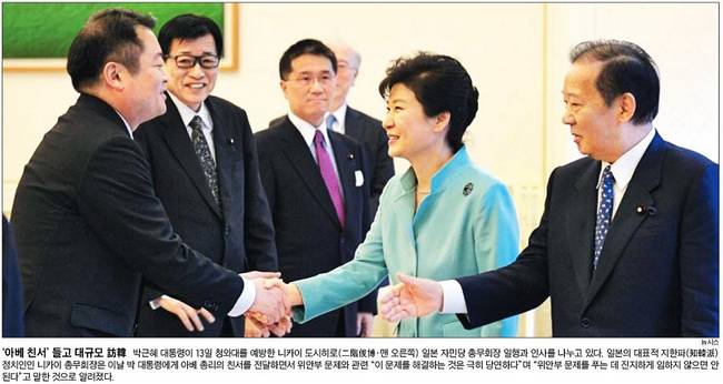 조선일보는 박근혜 대통령이 13일 청와대를 예방한 니카이 도시히로 일본 자민당 총무회장 일행과 악수를 나누는 사진을 1면에 실었다. 조선에 따르면 일본의 대표적 지한파 정치인인 니카이 총무회장은 이날 박 대통령에게 아베 총리의 친서를 전달하면서 위안부 문제와 관련 “이 문제를 해결하는 것은 극히 당연하다”며 “위안부 문제를 푸는데 진지하게 임하지 않으면 안 된다”고 말한 것으로 알려졌다.