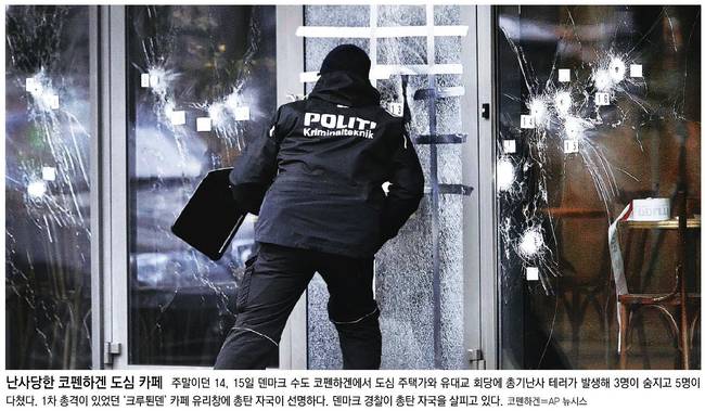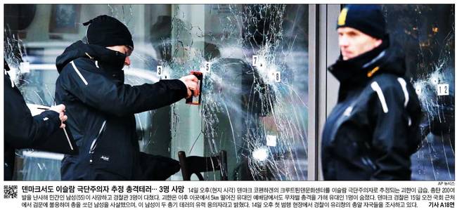 동아일보, 서울신문, 조선일보는 이날 1면 사진 기사를 통해 지난 14, 15일 덴마크 수도 코펜하겐에 위치한 도심 주택가와 유대교 회당에 총기난사 테러가 발생해 3명이 숨지고 5명이 다친 사건 소식을 전했다.
