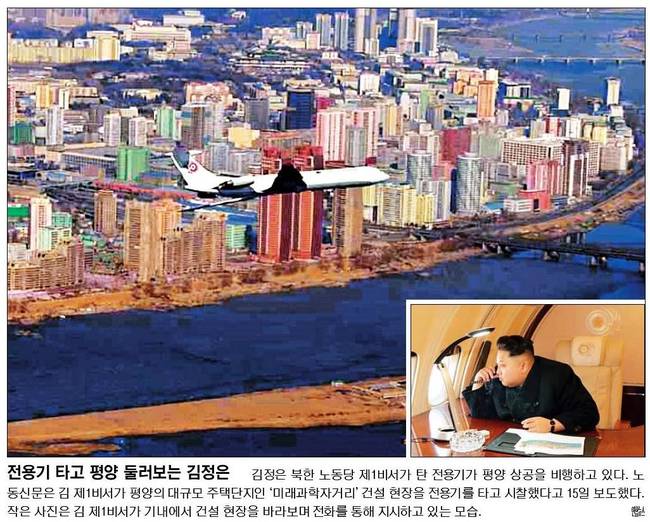 국민일보와 세계일보는 북한 김정은 국방위원회 제1위원장이 전용기를 타고 평양의 대규모 주택단지인 '미래과학자거리' 건설 현장을 시찰했다고 노동신문의 15일자 보도를 인용했다.