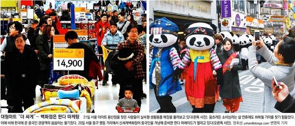 동아일보는 22일 1면 신문 사진으로 설 연휴 소비현장 모습을 담았다. 동아일보는 21일 서울 이마트 용산점을 찾은 사람들이 실속형 생활용품 매장을 둘러보고 있는 모습과 20일 서울 중구 명동 거리에서 신세계백화점이 중국인을 겨냥해 판다 퍼레이드를 준비한 모습을 1면 사진으로 전하면서 “움츠러든 소비심리는 설 연휴에도 회복될 기미를 찾기 힘들었지만 한국에 온 중국인 관광객의 씀씀이는 활기찼다”고 보도했다.